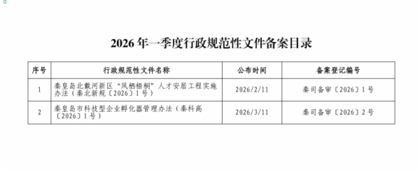 根据《法规规章备案审查条例》《河北省规范性文件管理办法》等有关规定,现将各县区政府(含秦皇岛开发区、北戴河新区管委会)和市政府各部门2026年1月1日至2026年3月31日报送备案的行政规范性文件目录予以公布。